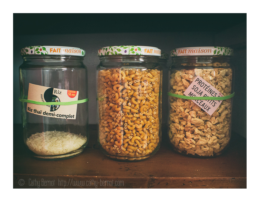 Peut-être êtes vous comme moi : on remplit soigneusement des pots en verre d’un tas de trucs, on note scrupuleusement ce qu’ils contiennent (perso, j’ai un faible pour les étiquettes à l’ancienne, à la Dymo). Et puis très vite, plus rien ne correspond : le pot marqué azuki contient du chanvre, le pot de farine de souchet contient de la farine de lupin… Bref, pas simple de s’y retrouver. Du coup, je suis en train de tester une astuce 100% récup : des pots de récupération, sur lesquels je place des élastiques, eux aussi de récupération. Je découpe sur mes paquets le nom des aliments, et si besoin, la date de péremption, et je les glisse simplement dans l’élastique. Cela tient bien, c’est réversible et je change aussi facilement de nom que de contenu !