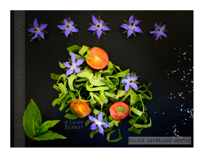 Revenons à la salade du jour! La feuille de bourrache a une saveur aqueuse délicate, qui se situe entre le concombre et la pastèque. J’ai eu envie de l’associer à la menthe, pour la fraîcheur, et à quelques tomates cerises, pour le contraste de goût sucré-acidulé.